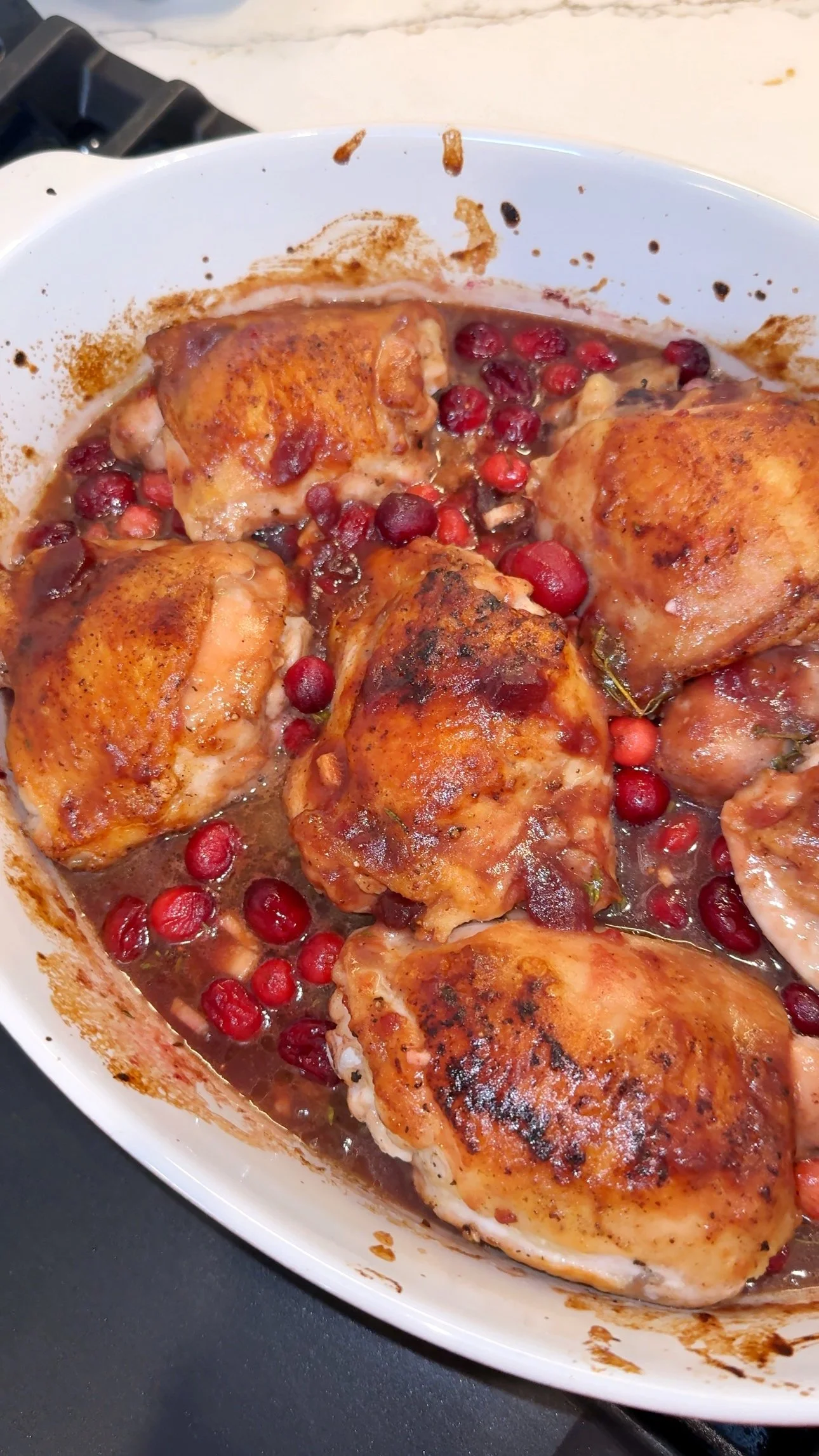 In a bowl, whisk together the cranberry sauce, fresh cranberries, orange juice, maple syrup, balsamic vinegar, Dijon mustard, garlic, and thyme.