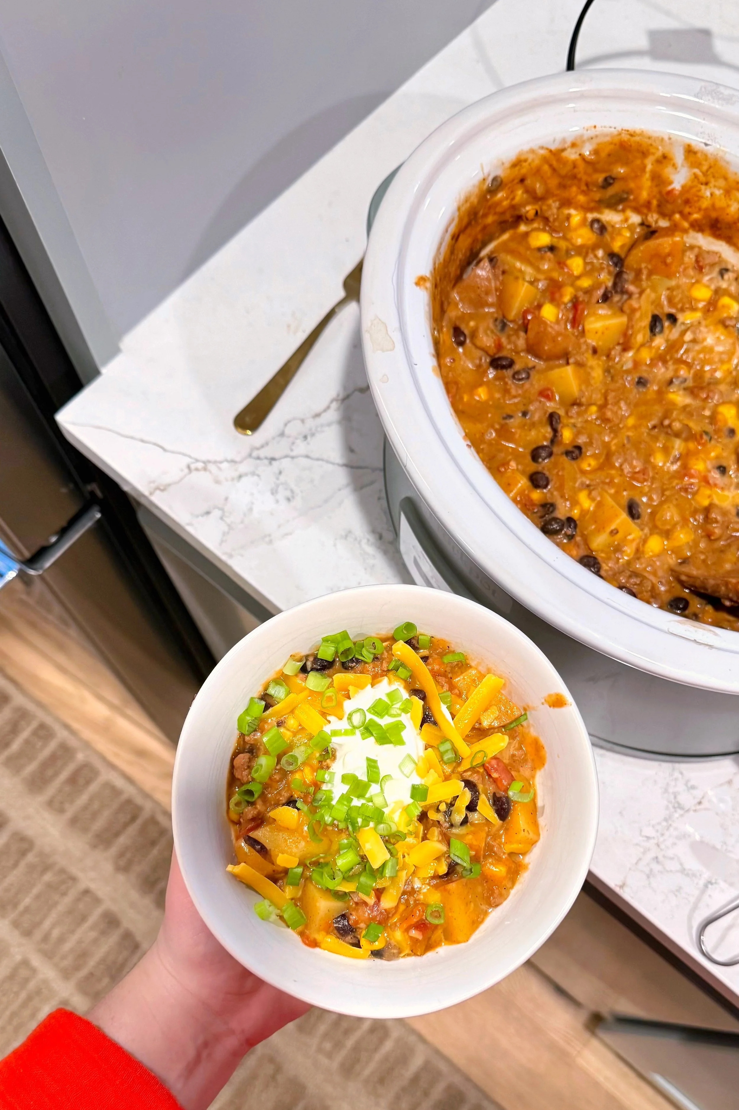 Serve warm with your favorite toppings. I usually add extra shredded cheddar, more sour cream, and sliced green onions. Enjoy!