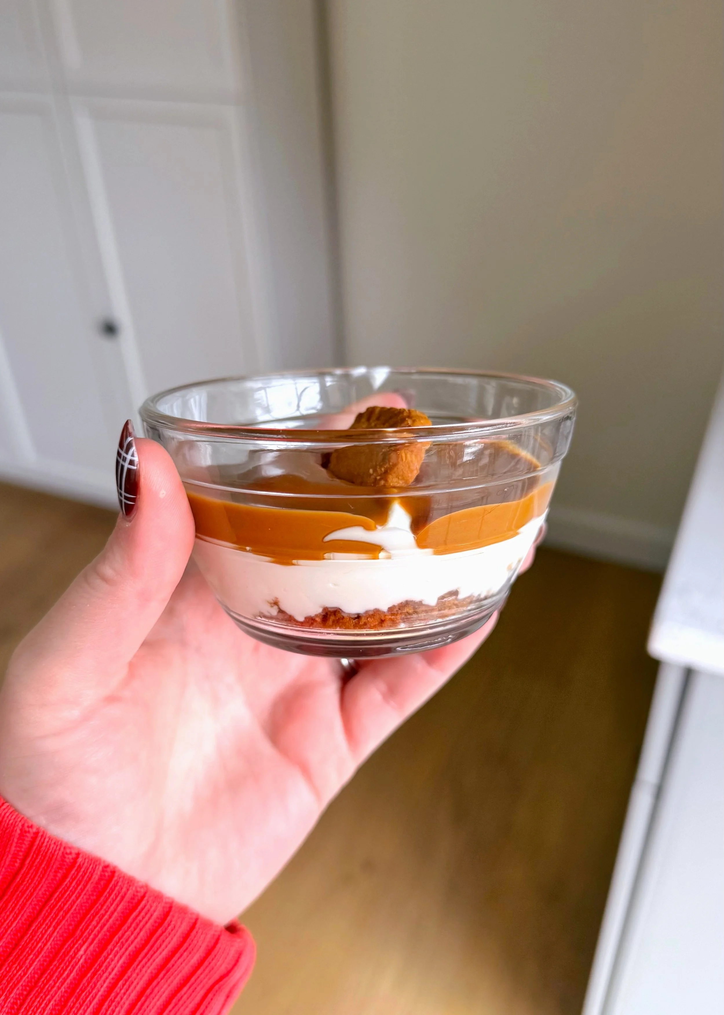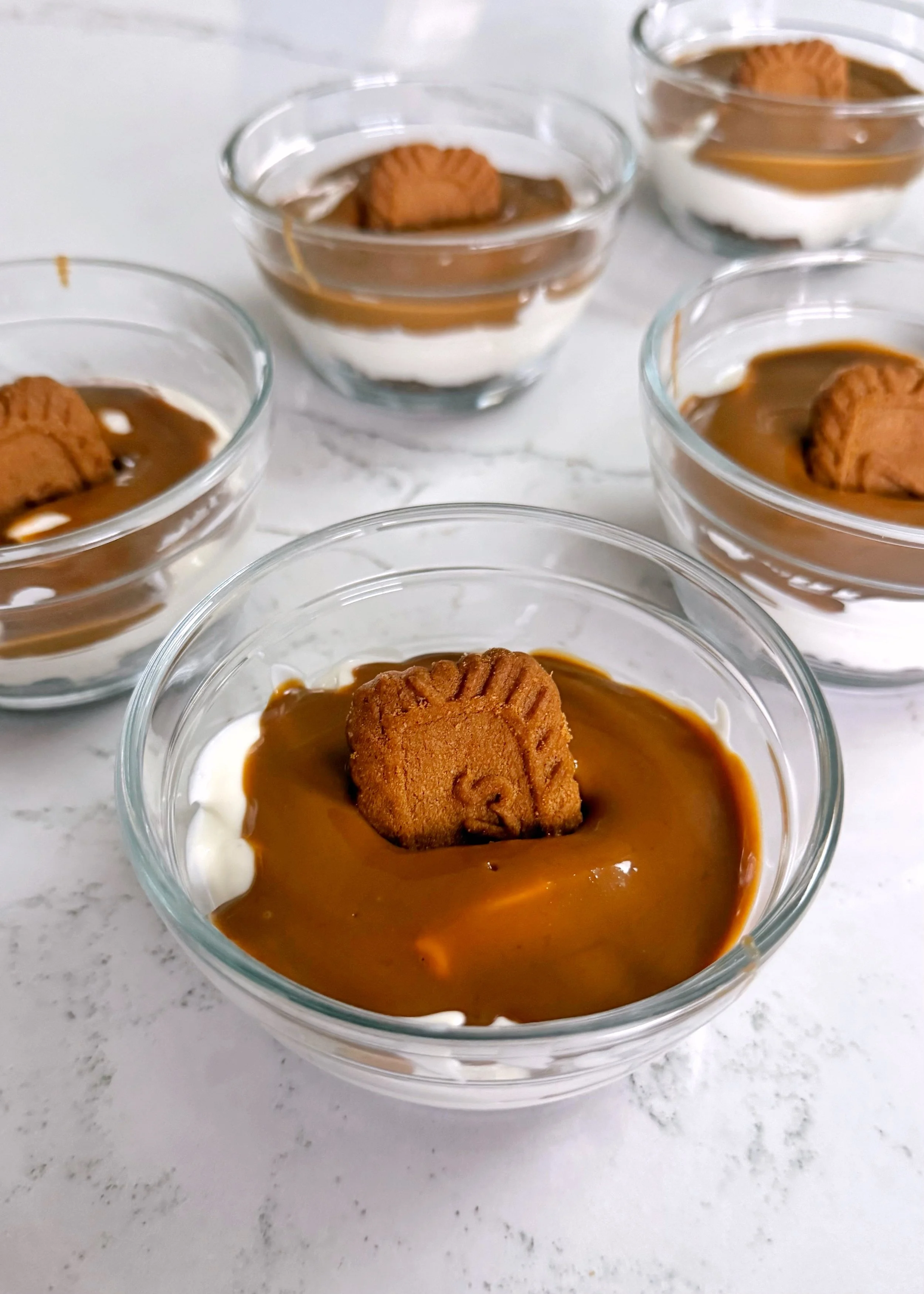 Drizzle an even layer of the melted Biscoff over each cup. This will create the hardened top layer once chilled, so try to coat the surface evenly.