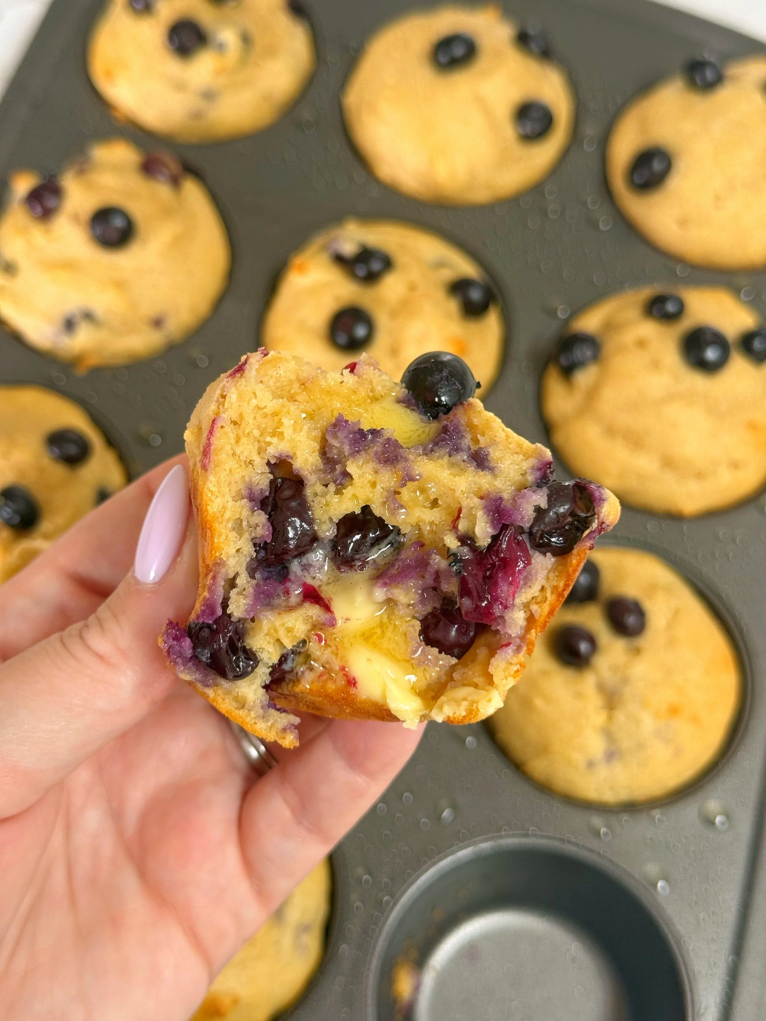 Divide the batter evenly into the muffin tin, filling each cup about 3/4 full. Top each one with a few extra blueberries.