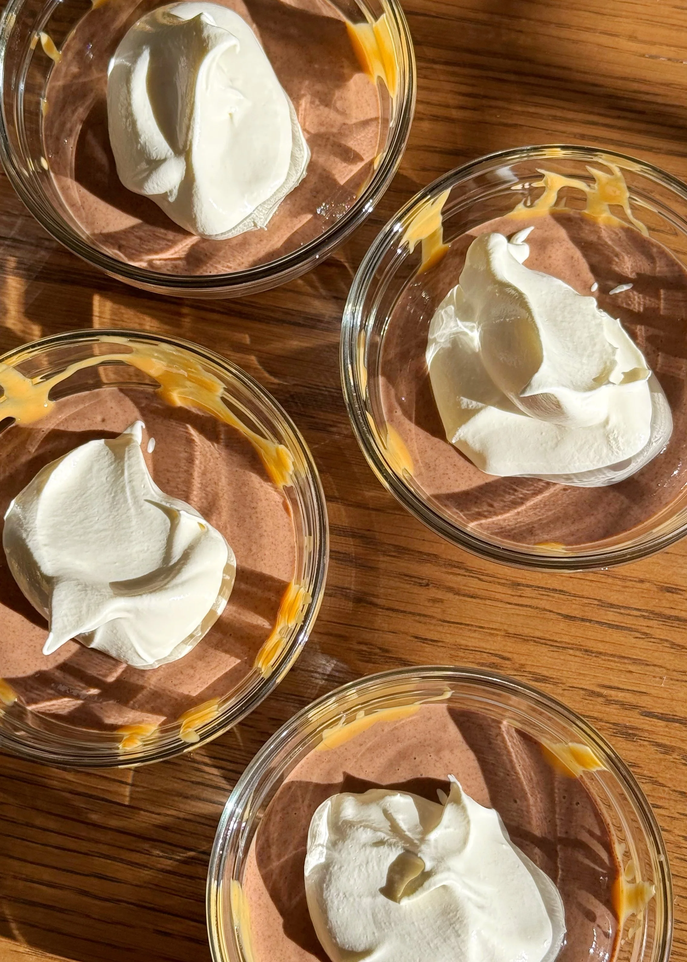 To assemble, drizzle a little peanut butter into the bottom of each dessert cup. Spoon the chocolate peanut butter mousse on top, then finish with a dollop of whipped cream.