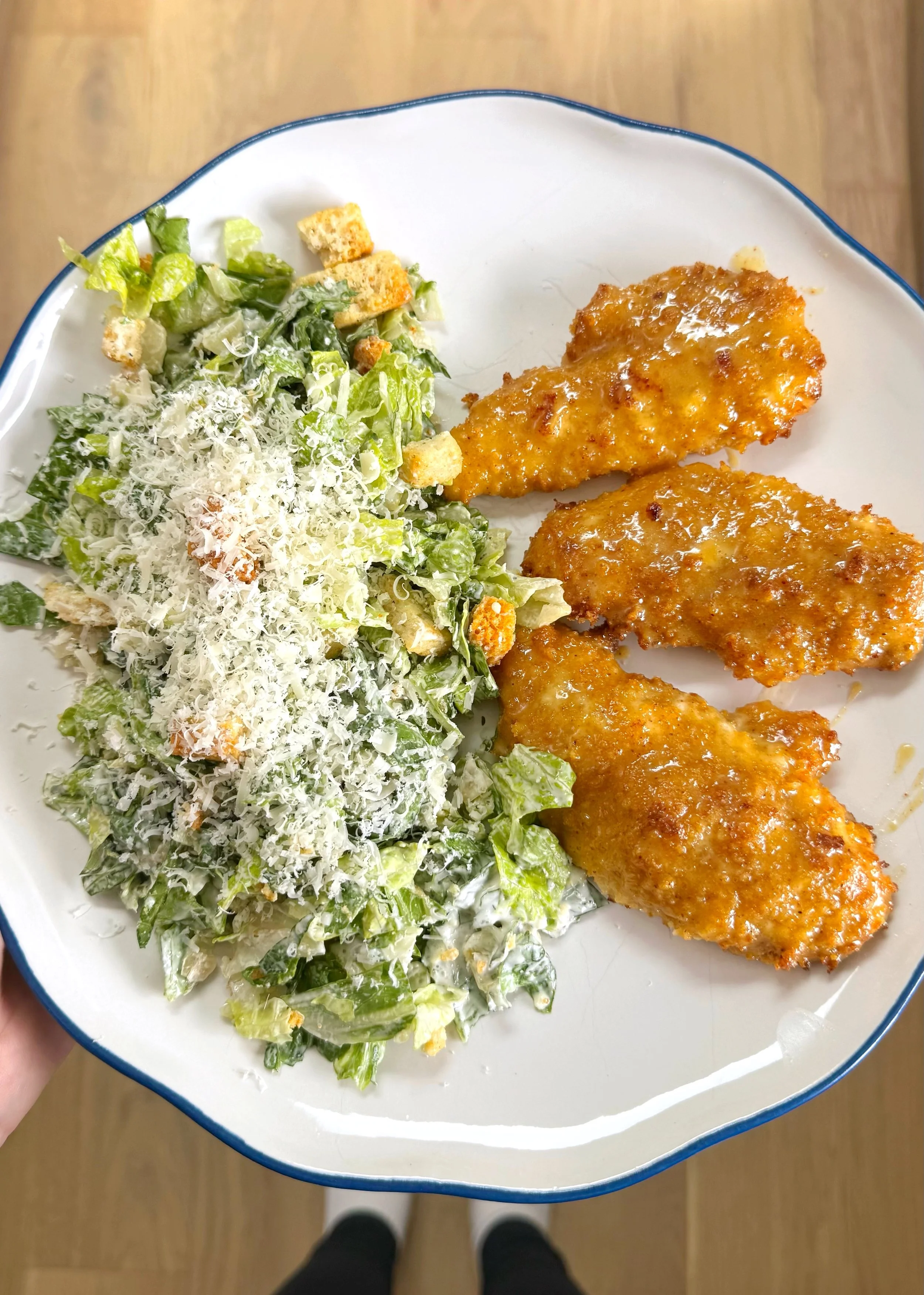 Dip each chicken tender into the egg mixture, letting any excess drip off. Then coat in the panko mixture, pressing lightly so it sticks well. Place on a plate or tray and repeat with the remaining tenders.