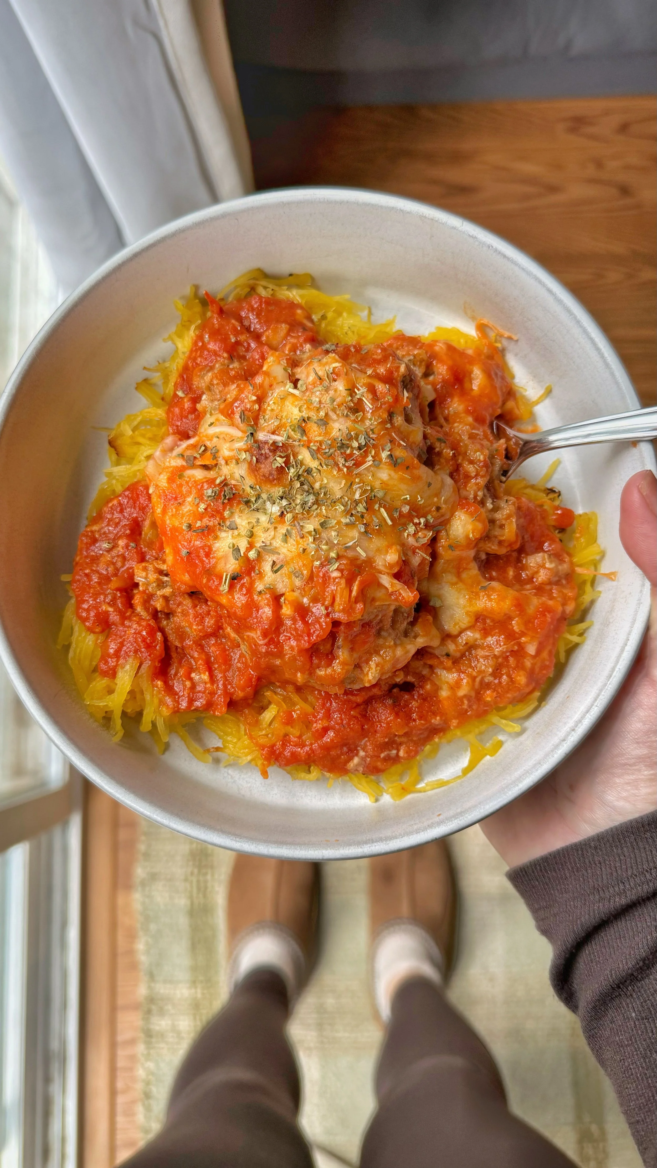 Once ready scoop out a few meatballs and extra sauce and place it on top of some spaghetti squash or your favorite pasta! Enjoy!