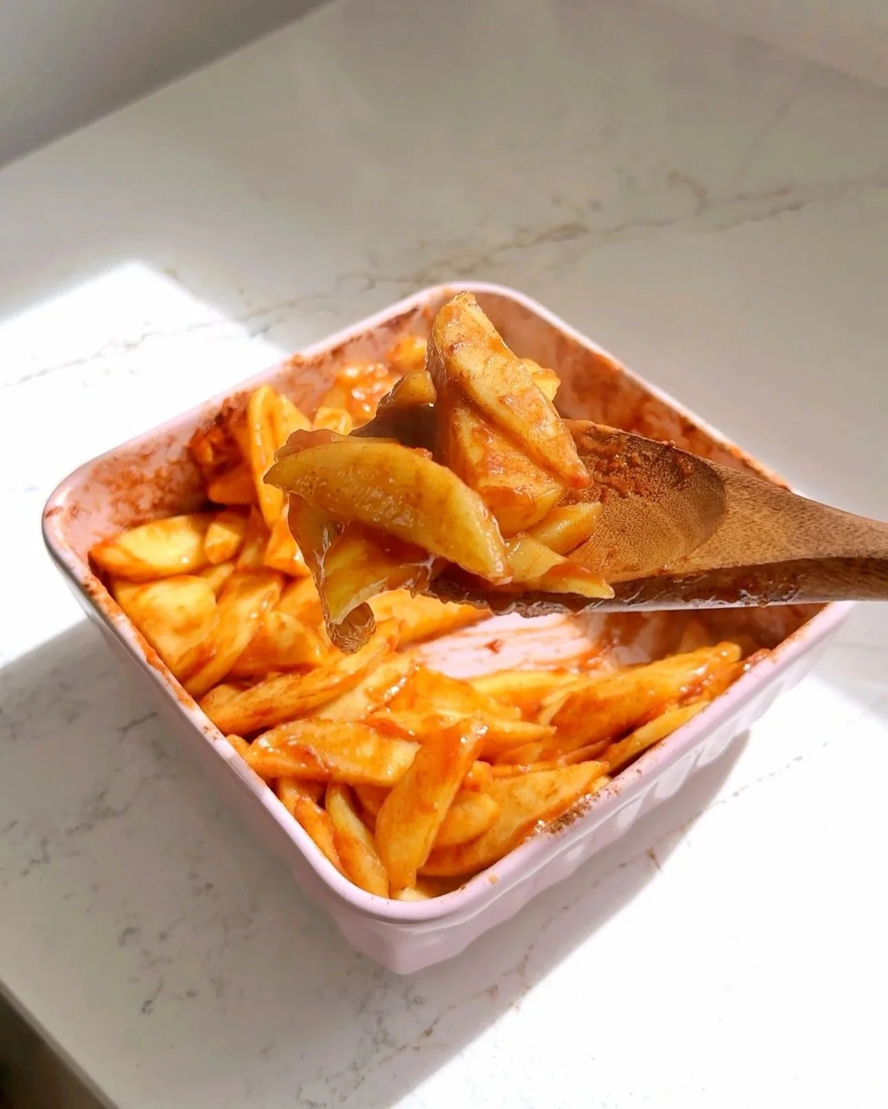 Pop the dish in the oven and bake for 25-30 minutes, stirring every 10 minutes, until the apples are soft, golden, and the sauce has thickened.