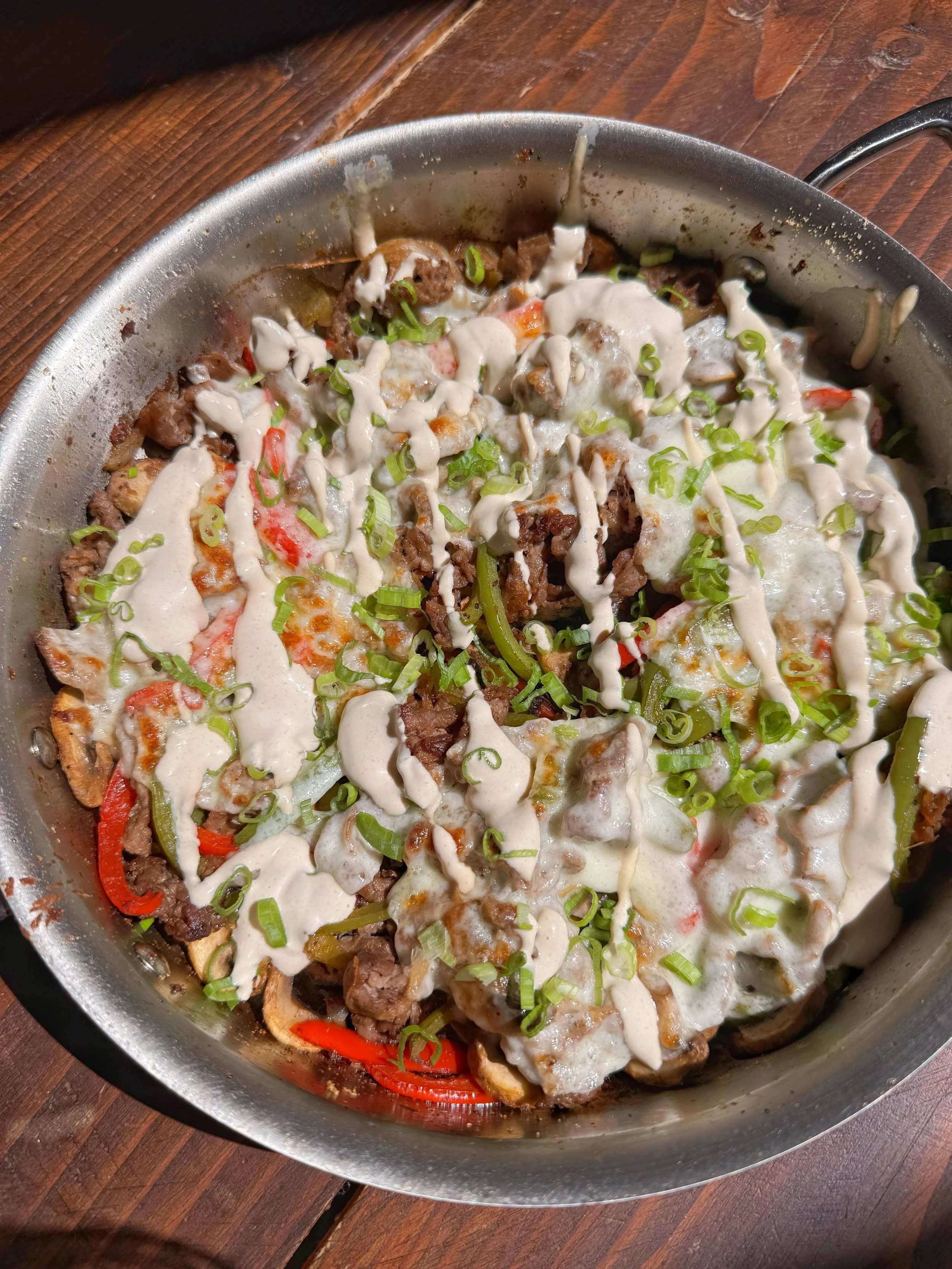 Return the steak to the skillet with the veggies and stir to combine. Arrange 4–6 slices of provolone cheese over the top. Place under the broiler on high for 2–3 minutes, until the cheese is melted and lightly browned.