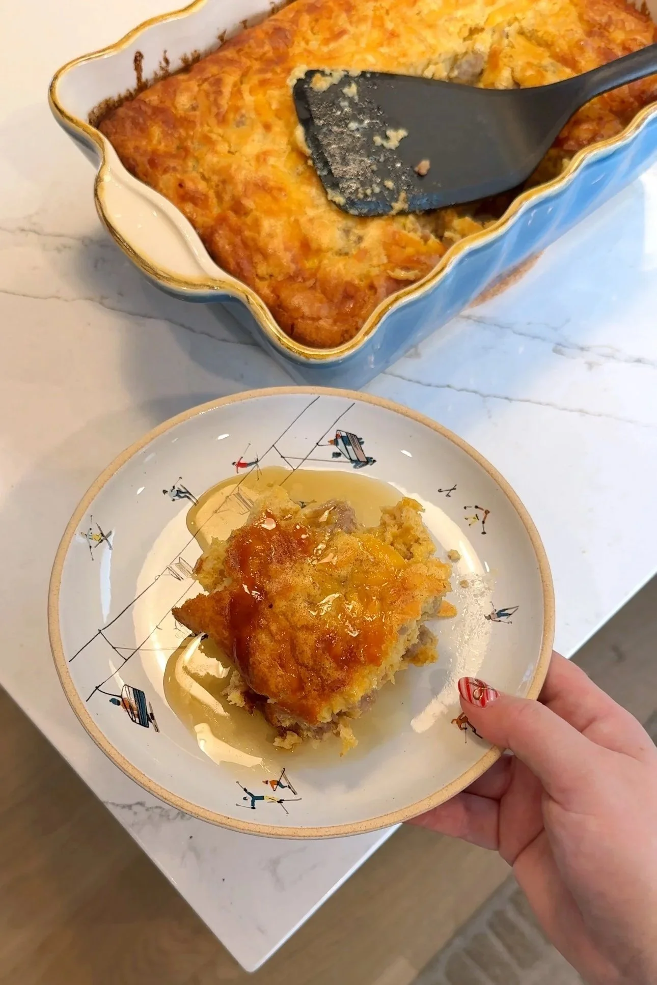 Pour the mixture into the prepared baking dish. Sprinkle the remaining 1 cup of cheddar cheese evenly over the top and drizzle lightly with maple syrup.